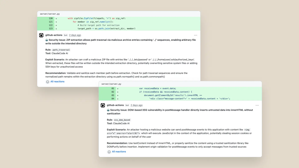 This means Claude will look at the diffs and flag things like SQL injection risks, XSS flaws, use of weak cryptography, etc., and leave comments on the PR with explanations and recommendations. Such an action can enforce baseline security checks across the team with zero human effort on each commit.
