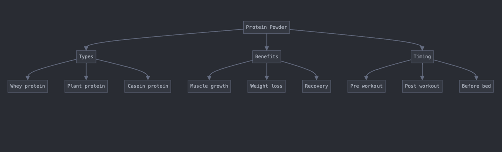 Types (different kinds of protein like whey, plant, casein), Benefits (user goals such as muscle growth, weight loss, recovery), and Timing (when to use it: pre workout, post workout, before bed). Such a structure could inform the website’s navigation and content. For instance, a supplement store might have subcategory pages for protein powder types (whey, plant-based, etc.), and create content sections or filter tags for benefits and timing (e.g. pages or guides on using protein for muscle gain or the best protein to take post-workout). This hierarchical clustering ensures the site covers all facets of the user’s interest in protein powders, each cluster addressing a distinct intent or need.