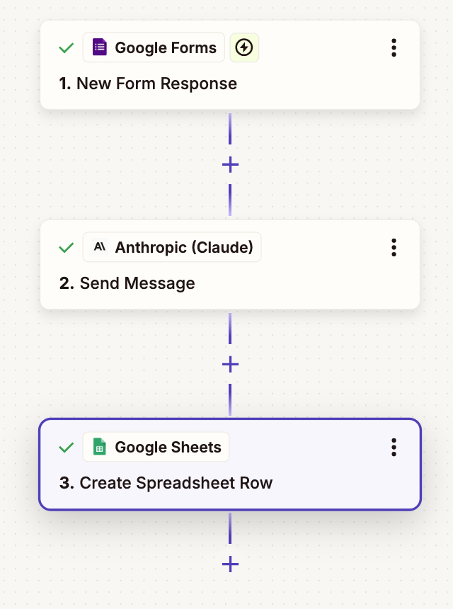 Workflow of integrating Google Forms with Claude and Google Sheets via Zapier. New form responses are sent to Claude for analysis, then results are added as a row in a Google Sheet.