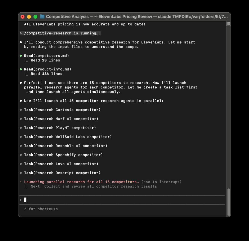 /competitive-researchcommand which launched 15 Claude agents, each researching one competitor simultaneously. In a minute or two, all 15 competitor profiles were done, saved into separate files. This massively accelerates analysis when you have many entities (competitors, products, or data segments) to analyze. Instead of doing them one-by-one or hitting API rate limits, Claude Code orchestrates parallel threads of work. The result: comprehensive competitive landscapes generated in minutes rather than hours.