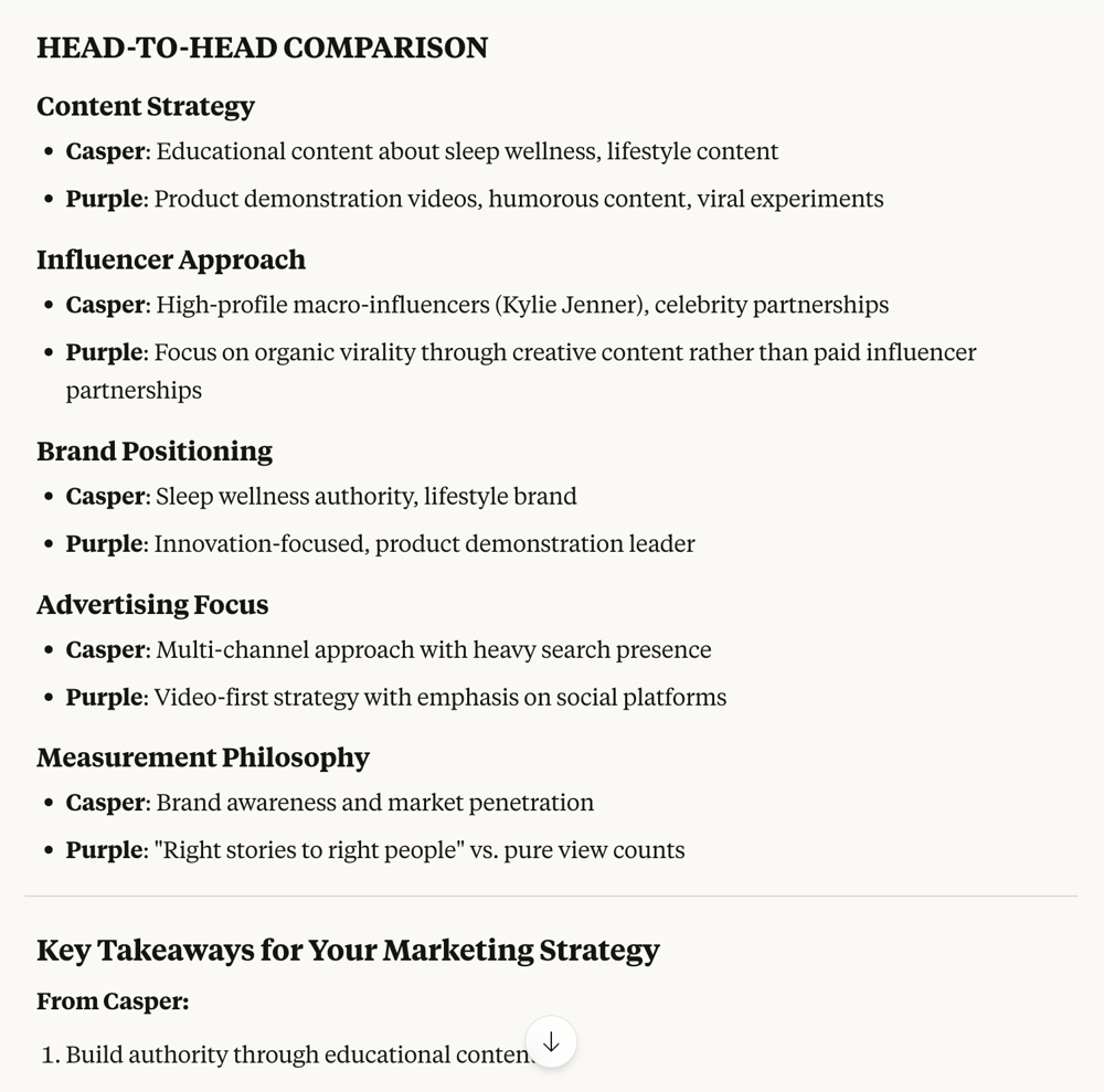 Claude can generate detailed head-to-head comparisons of competitors. For example, the analysis above contrasts Casper and Purple on content strategy, influencer marketing, brand positioning, advertising focus, and metrics philosophy. Such structured comparisons help identify each competitor’s strengths and strategic focus areas.